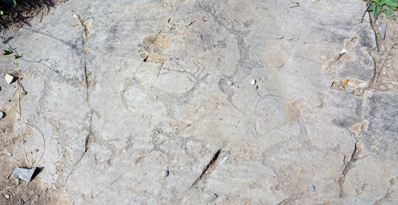 1) на скальных останцах каменной гряды, протянувшейся перпендикулярно долины реки. Общее число рисунков на разные сюжеты, вдоль северной стороны (влево) от полотна Чуйского тракта, в районе 717 км — 150 композиций;
