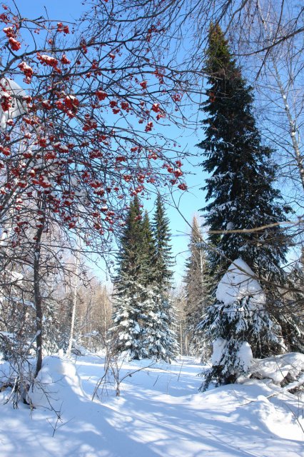 Очень красива тайга и осенью. Вечнозелёный колорит сосен и пихт дополняют в эту пору жёлтый, оранжевый и красный тона лиственных деревьев. То тут то там светятся среди листвы яркие огоньки плодов рябины, малины, шиповника, смородины.