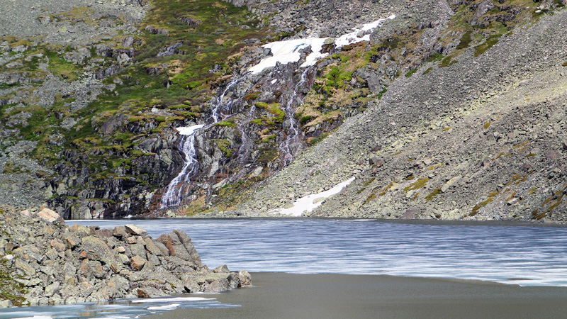 И ещё дальше на юго-восток через 450 метров можно попасть к небольшому Нижнему Семинскому озеру, расположенному на высоте 2204 м над ур.м. с максимальной длиной 190 м и шириной 90 м.