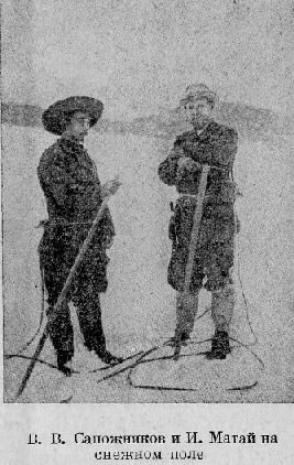 Что касается до нашего снаряжения, то оно состояло из палок, с кирками альпийского образца, толстой веревки в 15 сажен длины и сапог, подбитых гвоздями; из приборов я взял только фотографический аппарат, маленькую буссоль, два анероида и термометры; от первоначального намерения взять с собой еще теодолит я потом отказался, боясь слишком увеличить вес ноши.