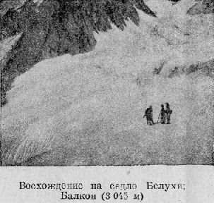 Моими спутниками на этот раз были: студент Томского университета Винокуров и три проводника -- Иннокентий Матай, Виталий Архипов и Капсим Кузьмин: все трое -- прекрасные ходоки, но вполне заслуженное предпочтение нужно отдать первому -- И. Матаю, неутомимому охотнику за каменными козлами и маралами. Его смелости и находчивости я много обязан как прошлогодним восхождением на седло Иик-ту, так и нынешним -- на седло Белухи (рис. на стр. 148).