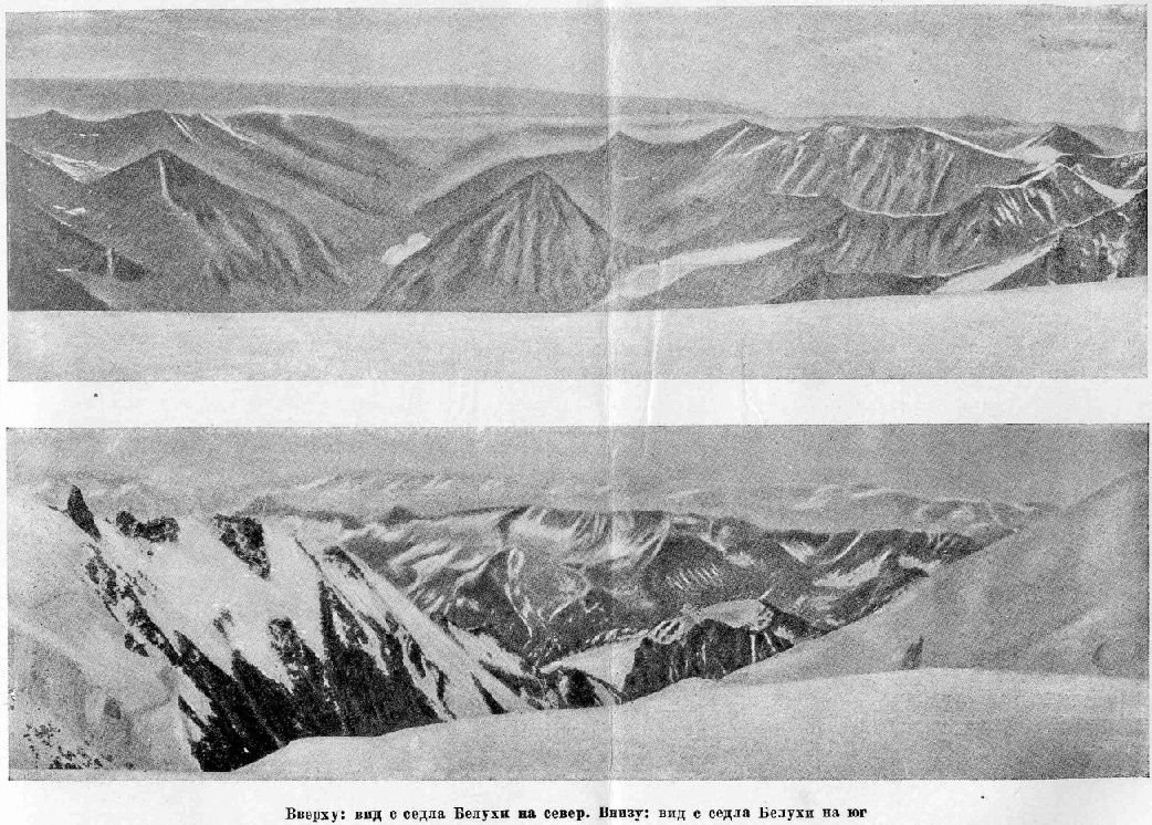 До верхушек конусов Белухи оставалось только около 500 м, но я воздержался от дальнейшего восхождения, удовольствовавшись достигнутым результатом. Того же мнения были и мои товарищи. И к тому было много причин. Прежде всего вершины еще плотнее укутались в облака, и восхождение, делаясь гораздо опаснее, теряло почти всякое значение, кроме значения спорта: оттуда мы все равно ничего не увидели бы. Во-вторых, явившись на седло разгоряченными и потными в легком платье, мы положительно коченели от двухградусного мороза при сильном порывистом ветре. Наконец был уже третий час, т. е. оставалось пять часов светлого времени -- ровно столько, чтоб успеть засветло спуститься по крайней мере к месту ночлега; ночевать же на вершине или на седле без теплого платья, и притом на голодный желудок, значило наверняка замерзнуть.