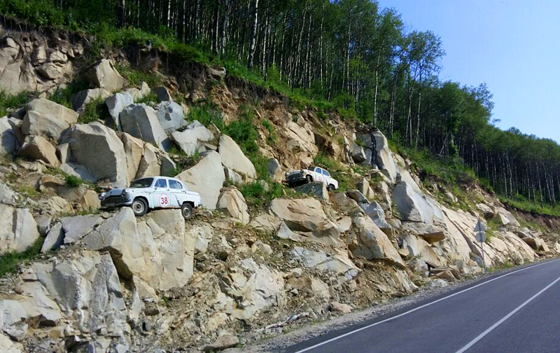 С арт-объектом тесно связаны, «в одной теме», и два «Москвича», установленные на склоне серпантина к северу от «Байкерского топора».