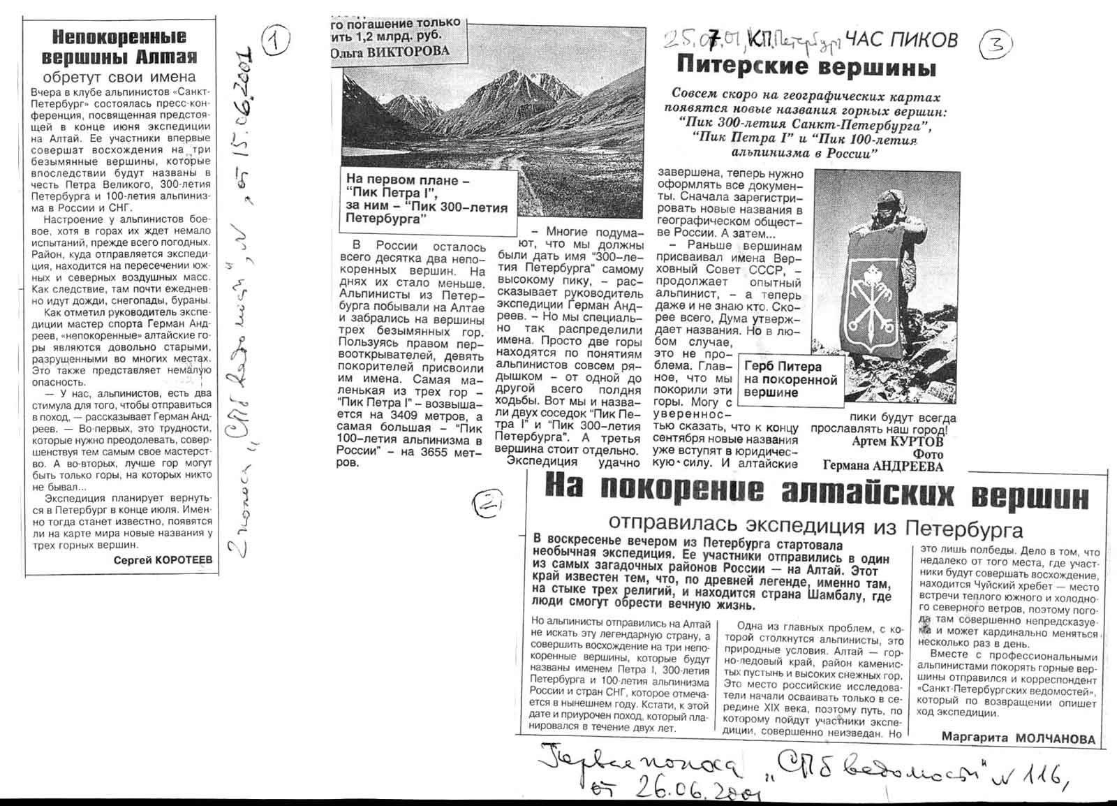 В 2001 г. петербургская экспедиция во главе с мастером спорта Германом Андреевым совершила первовосхождения на три горы Южно-Чуйского хребта. Высота названного ими пика «300-летия Петербурга» - 3485,8 м, вершины «Петра I» - 3475,8 м, пика «100-летия Русского Горного Общества», которое отмечается в 2001 году – 3196,1 м.