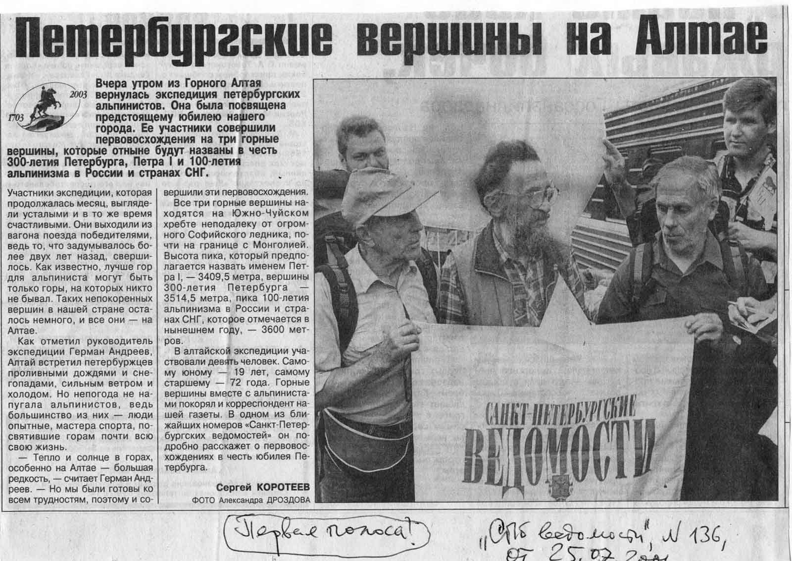 Считается, что в нашей стране осталось не больше десятка нехоженых, как называют их профессионалы, горных вершин. А теперь их стало еще меньше. Наша петербургская экспедиция во главе с мастером спорта Германом Андреевым возвратилась с Горного Алтая с победами. Альпинисты покорили три горы Южно-Чуйского хребта недалеко от границы с Монголией. Высота названного ими пика «300-летия Петербурга» - 3485,8 м, вершины «Петра I» - 3475,8 м, пика «100-летия Русского Горного Общества», которое отмечается в 2001 году – 3196,1 м.