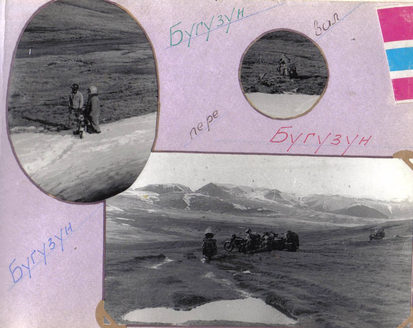 28 июня. Перевал Бугузун — граница Алтайского края с Тувинской АССР. Склоны и дорога еще под снегом. Попытка пробить в нем тоннель тяжестью разогнавшегося мотоцикла не увенчалась успехом. С трудом извлекаем машину из снежного плена. Идем в обход снежника болотом. Снова поминаем добрым словом замечательную кроссовую резну. Сколько сил она нам сохранила!