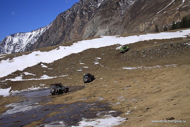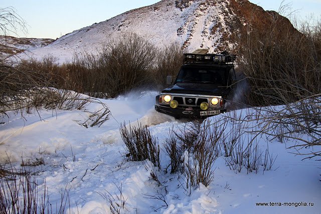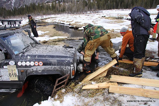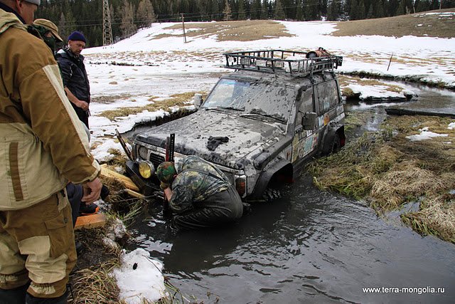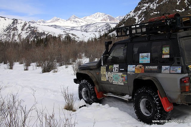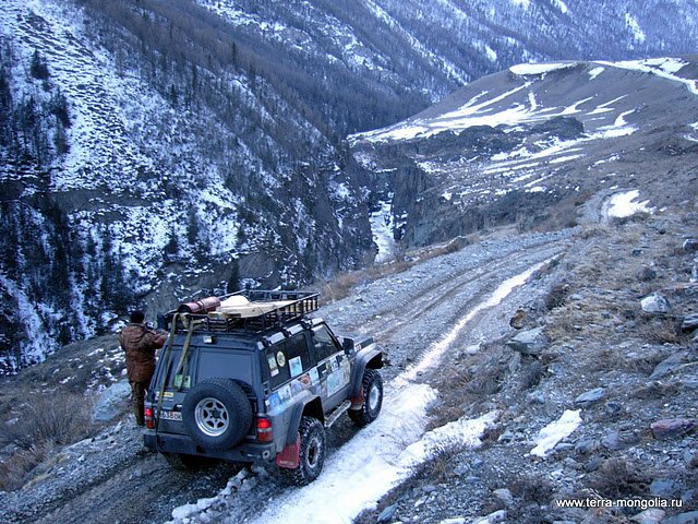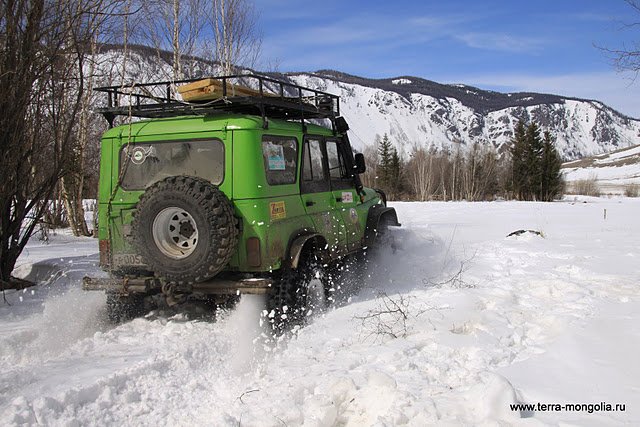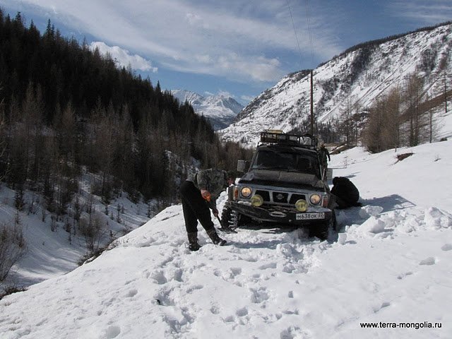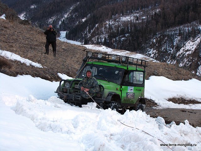 Конечно, как же не хлебнуть неприятностей, да ещё и по собственной воле? Река Юстыд, откуда начинаются малые ручьи водораздела, перемерзла до самого дна и хрустит-звенит под шинами. Казалось бы, снега там всего ничего, да снежные ямы, где протекторы на колесах быстро замыливаются. В ход пошли и трос и лебедки. Солнце быстро падает за горы и ночевать среди заснеженной горной тундры не входило в наши планы, мы приложили усилия и выскочили на твердый грунт. Уже в темноте пришли (ага, «пришли», сломав две лопаты и порвав два троса) в Курай, где затопили печь, которую мы немедленно заставили промокшей обувью. Рабочий день начинается в жестком режиме: еще в темноте стартуем в восемь утра, а режим передней передачи заканчивается в восемь вечера. На сон остается чуть больше шести часов.