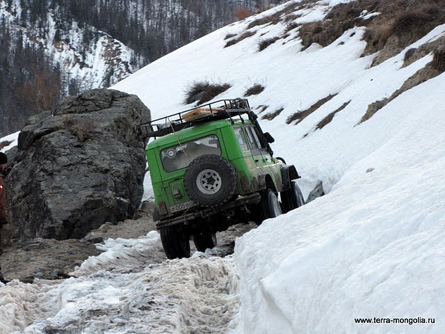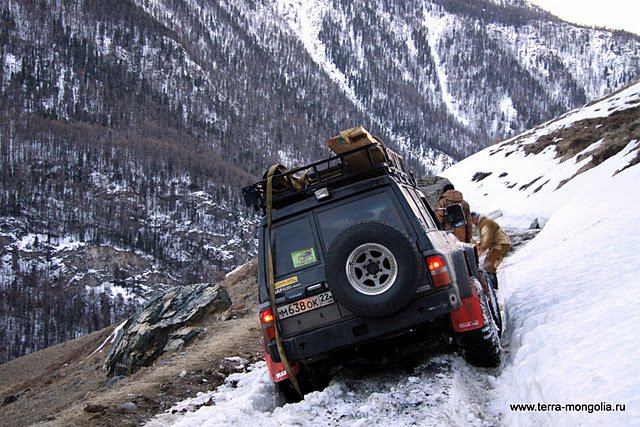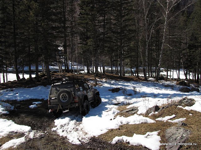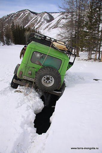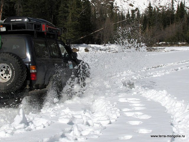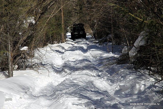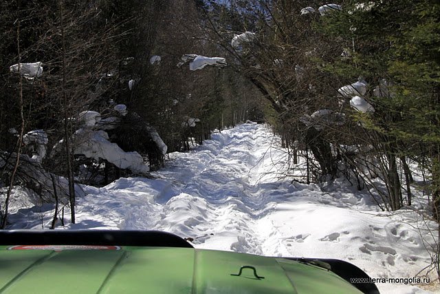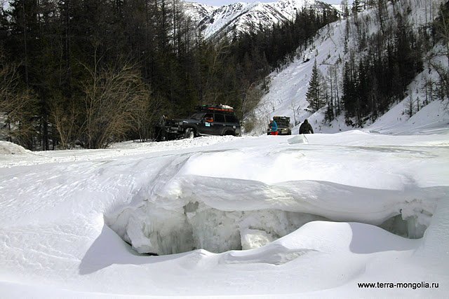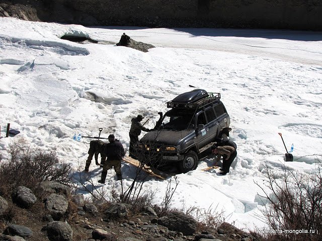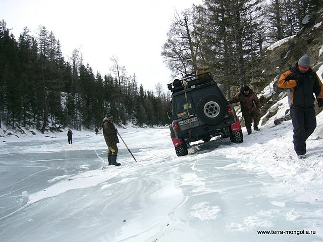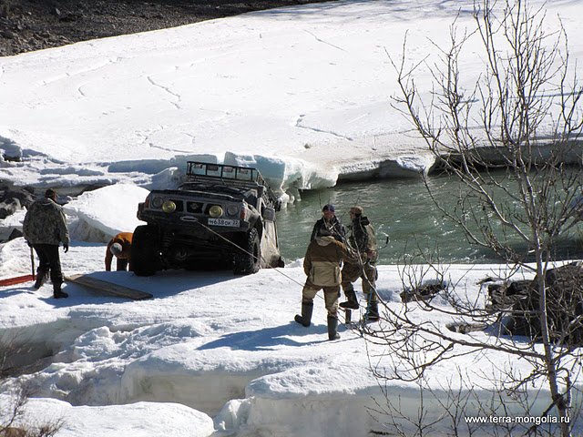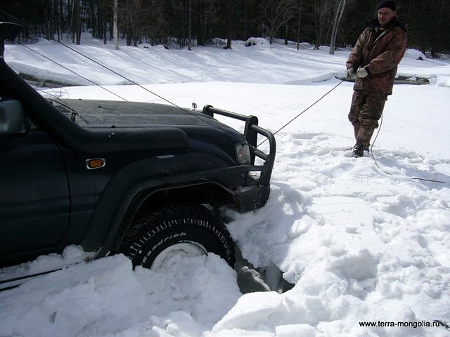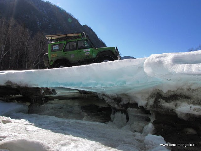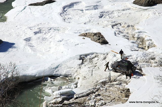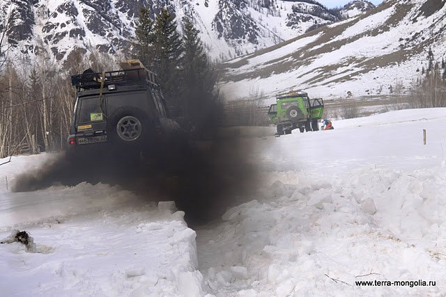 Утром над нами мрачно громоздятся горы, тень от них накрывает нас и нет никаких намеков, что где-то весеннее солнце и приближающаяся весна. Ха! Вот оно – солнышко! И сразу веселее звучит звук рвущегося троса лебедки и хруст сломанной лопаты. Впереди ледяной залом и промоина. Ощупью двигаемся в прибрежном малорослом лесу кустарника. Штурманы стоят на заднем бампере и уклоняются от веток. Холодные хлопья снега с веток сыпется на лицо и за воротник.