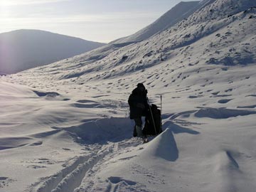 Немного хочется сказать о растительности (древесной). Граница лесной зоны проходит на высоте 500-600 м. Поэтому большинство ночевок, путешествуя по этому району зимой, можно сделать теплыми (с дровами и печкой). Окинув беглым взглядом Приполярно-Уральскую тайгу, приходит мысль, что победнее она Алтае-Саянской. Может быть, Севером ее придавило. Преобладающими породами, на участках, где мы были, являются лиственница и береза. Интересен тот факт, что береза поднимается здесь до крайней границы леса, тогда как на том же Алтае, она не дотягивает до нее километр по высоте. Ниже границы зоны леса встречаются ель, пихта, кедр. Но, я бы не назвал их распространенными видами деревьев.