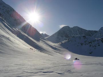 Помню плохо. Пили много вина и еще чего-то. Немыслимо большая вахтовка, куда влезло нас человек, наверно, сорок. Ехали долго. На одной из остановок Долматов вместо вина купил три пары носков. Муторная ночь в подпрыгивающей и дрожащей будке машины с полубредовым сном. На утро деревня Саранпауль – восточные ворота Приполярного Урала. После пива стало легче. Из Саранпауля доехали до места со странным названием – хребет Дьявол-Из. Три – то ли вагончика, то ли избы – в которых почему-то штабелями лежали горные лыжи. Заготовка дров и устройство быта плавно переросло в обсуждение планов с небольшой попойкой и хождением по вагончикам, знакомствами с еще незнакомыми и т.д.